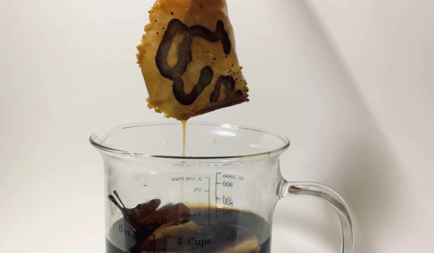 Sample swatch stamped with Chromobacterium Violaceum is placed into acorn tannin in order to turn the purple pigment into black pigment.